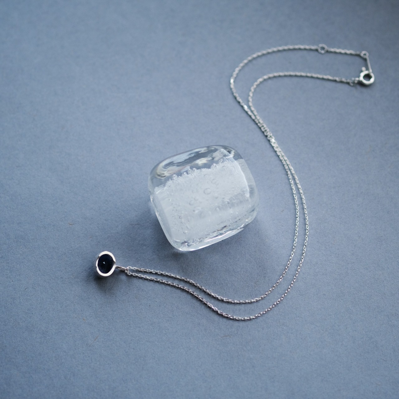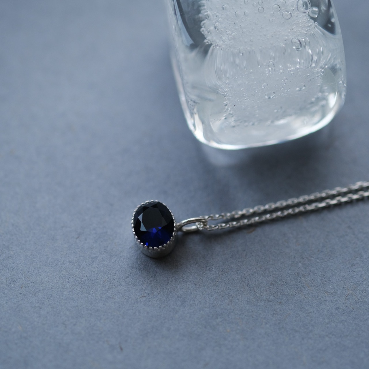 一粒のサファイアをあしらった大ぶりネックレス。