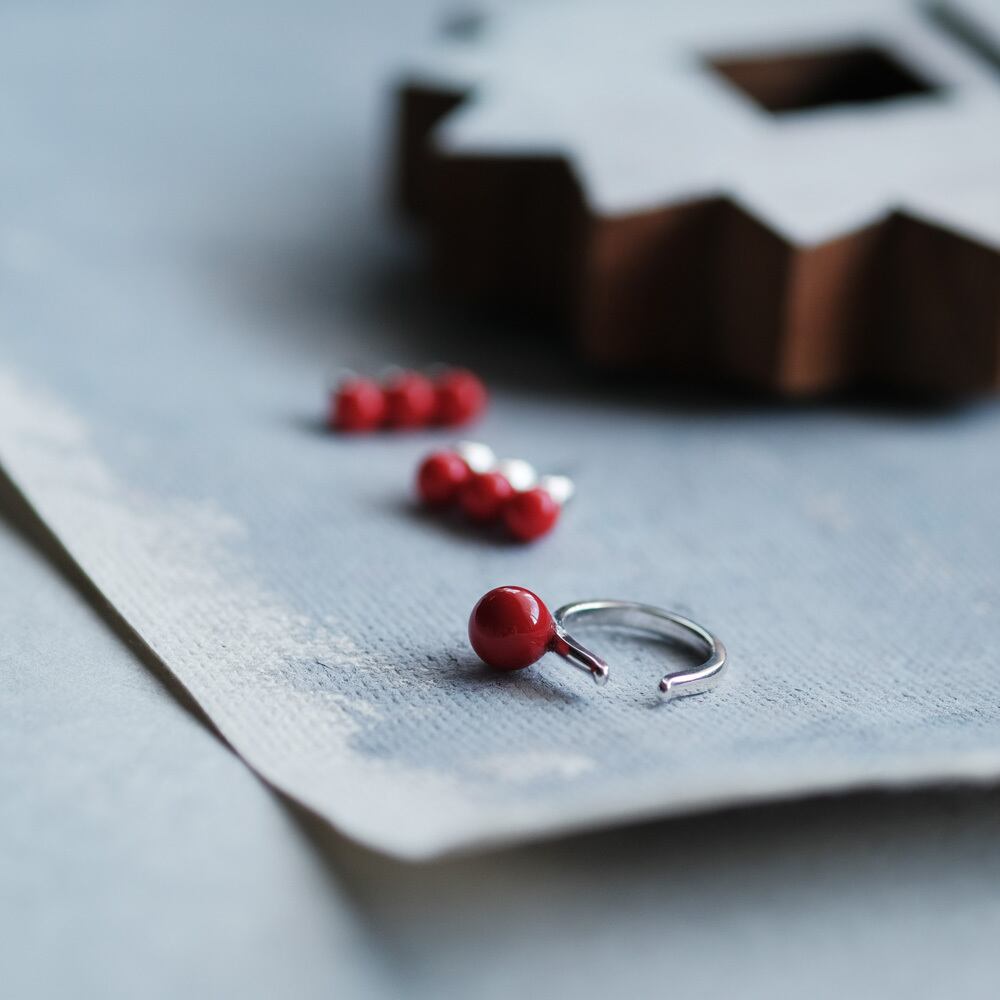 プレーンなデザインに一粒の赤珊瑚が添えられた